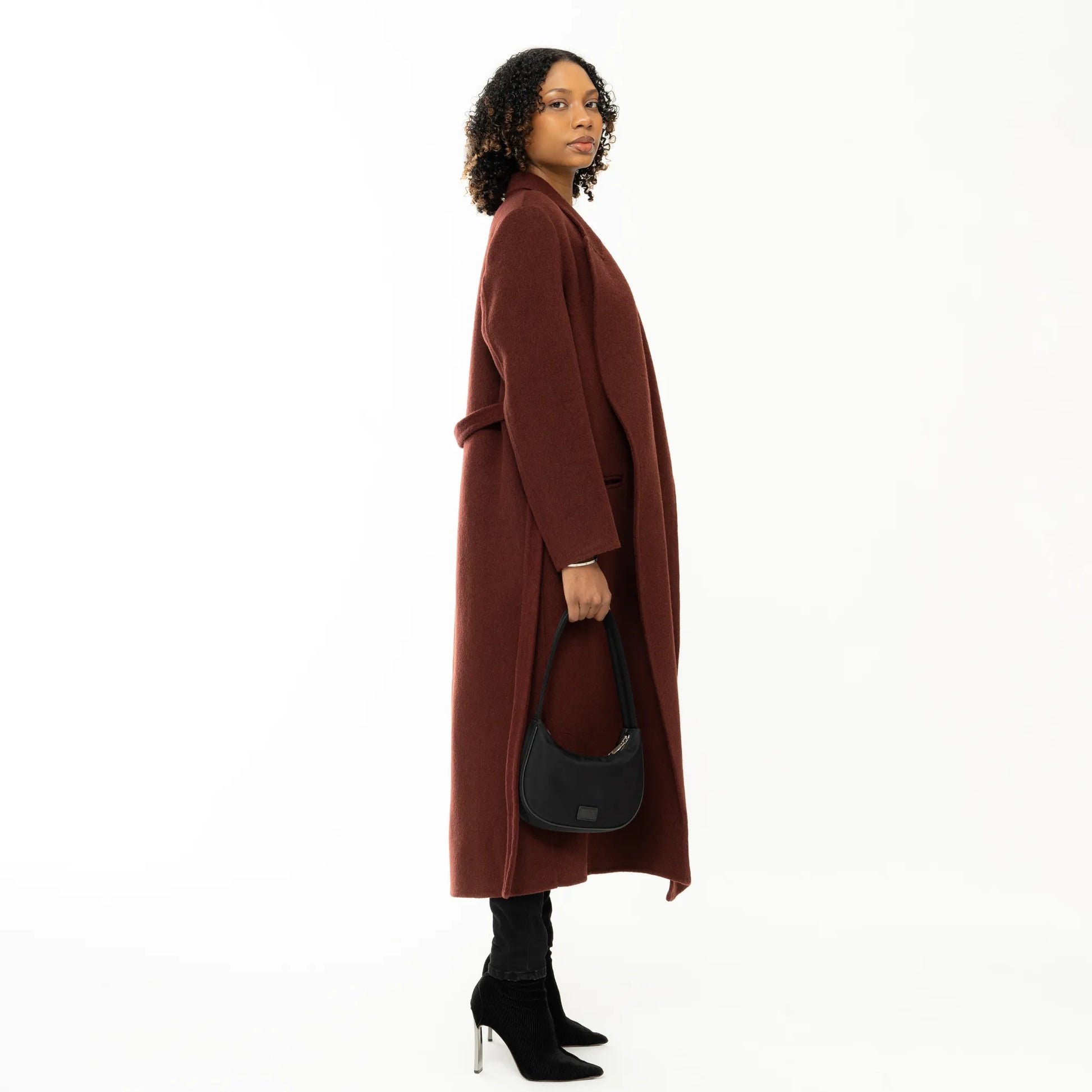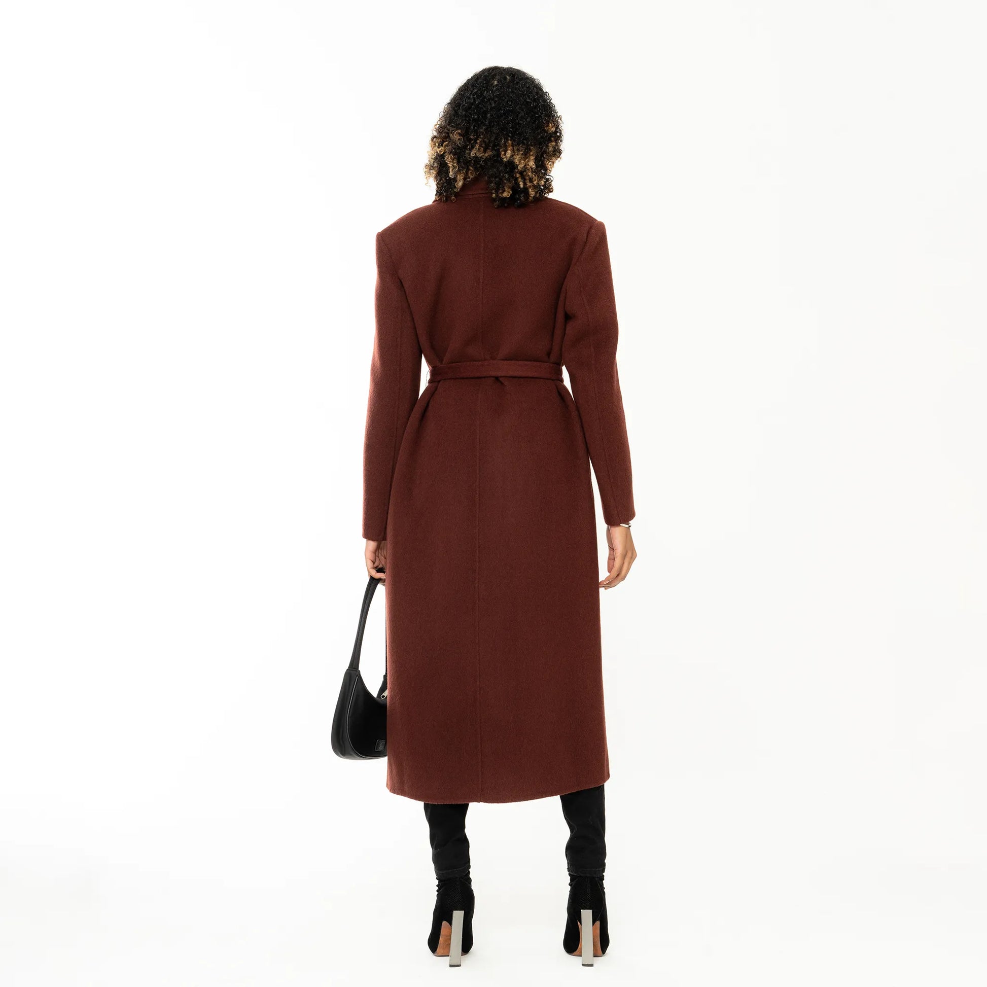 Elegant yet practical, this coat works from office hours to evening plans — equally perfect for power walks through the city or slow Sunday coffees. The deep chestnut tone adds a touch of understated luxury to any outfit.