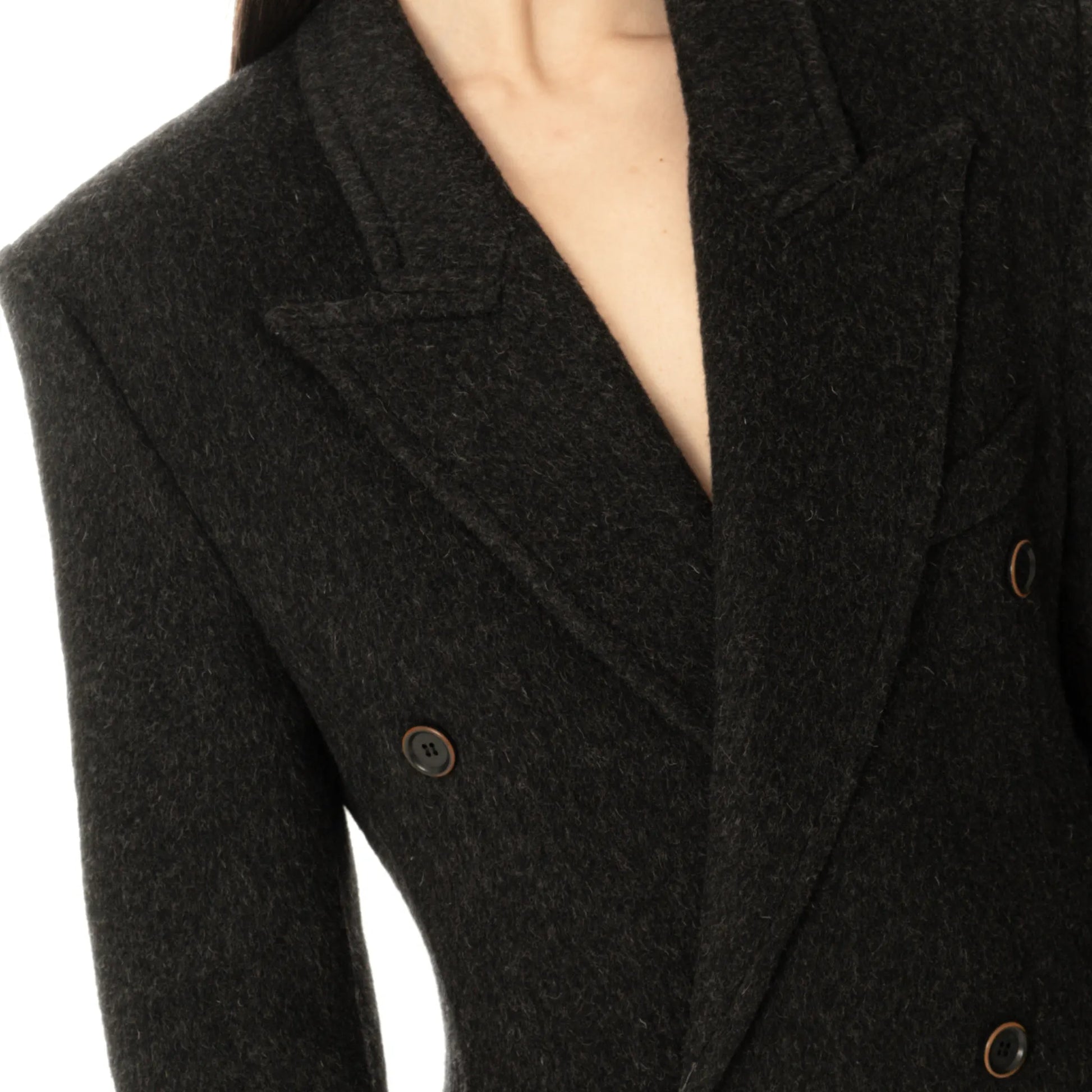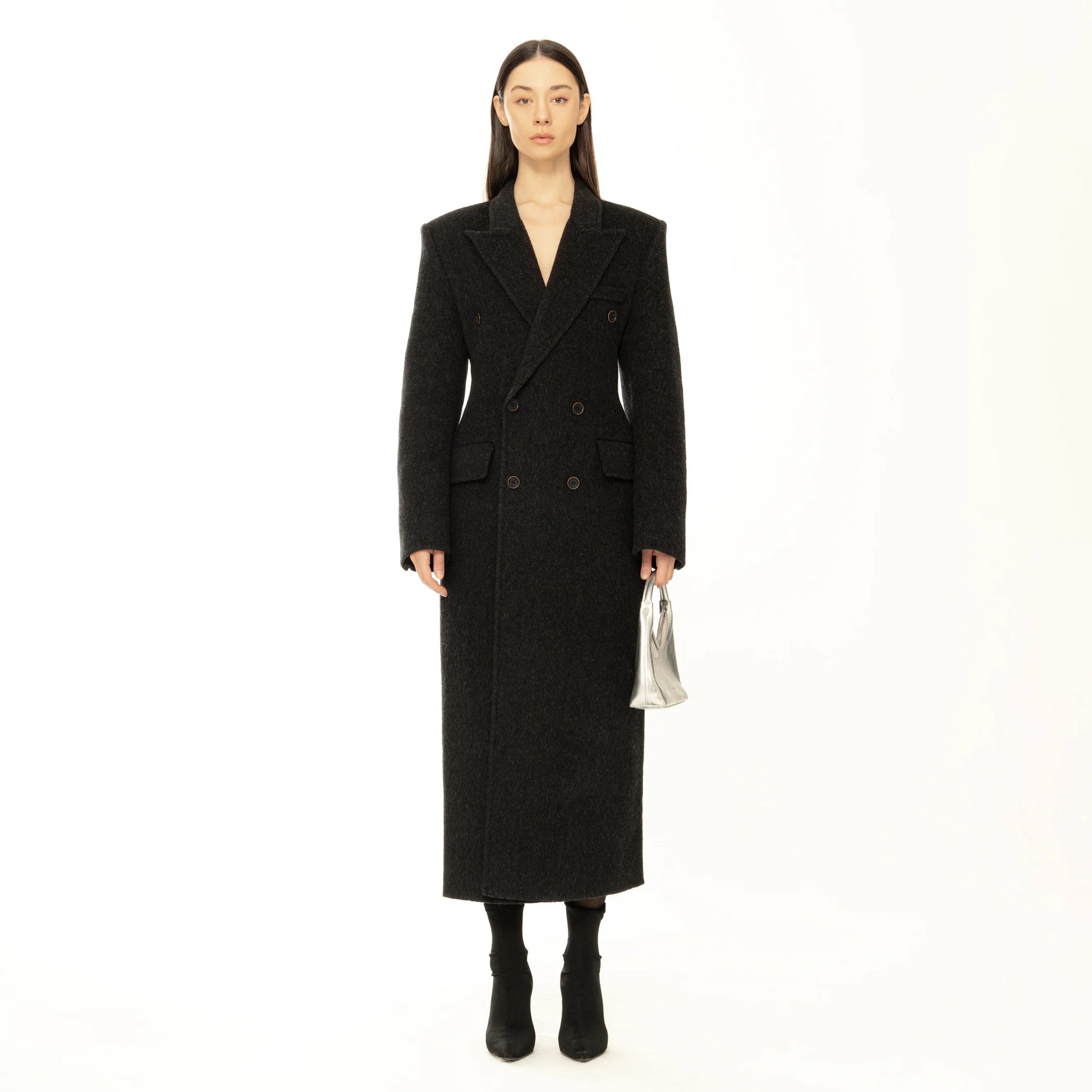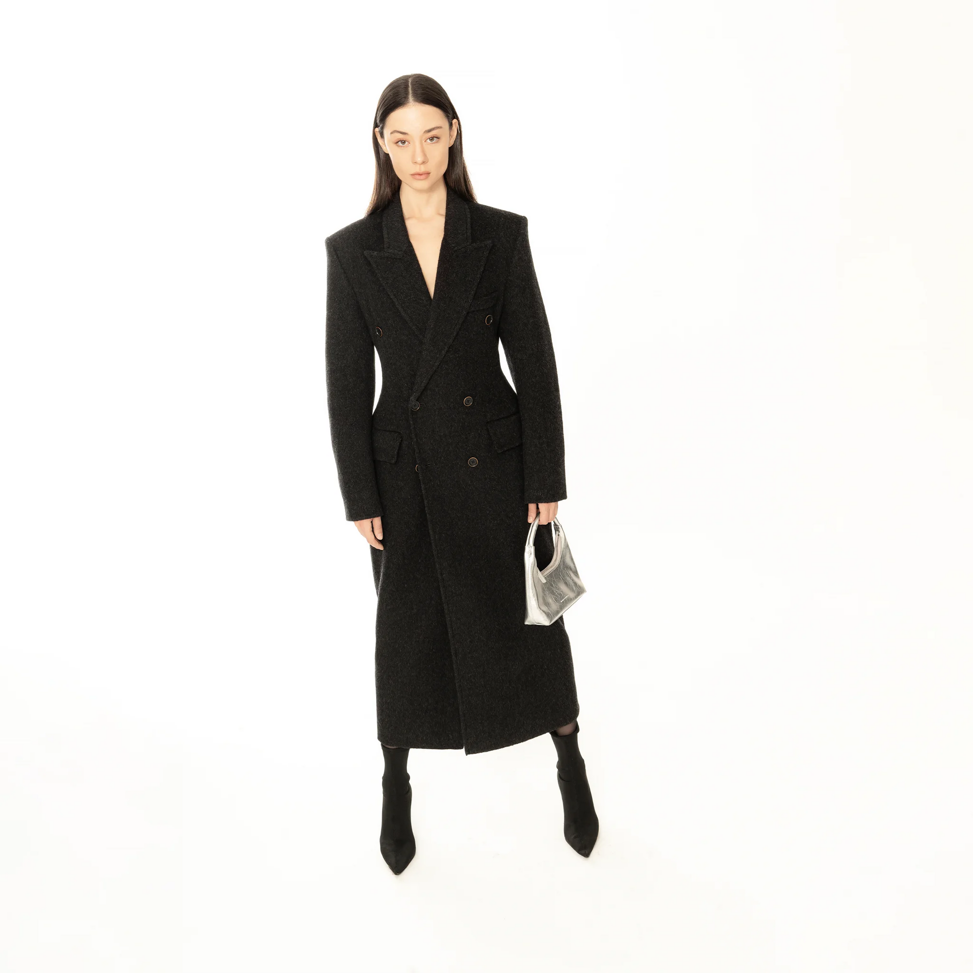 Crafted from 100% premium wool, it features strong shoulders, a double-breasted front, and a really long, structured silhouette that instantly drives attention. This coat elevates any look — from tailored trousers to minimal evening wear. It’s not just outerwear; it’s a presence.