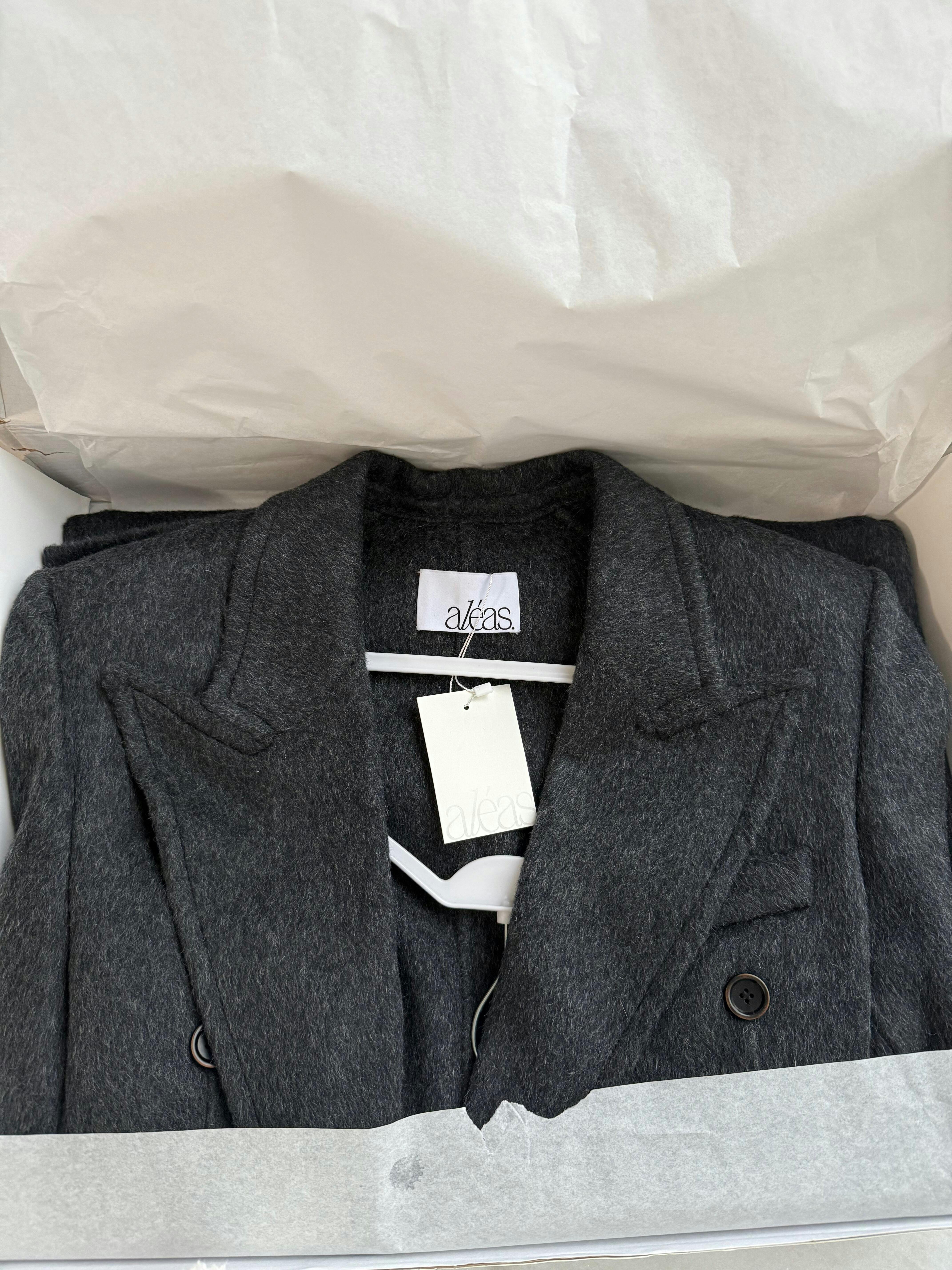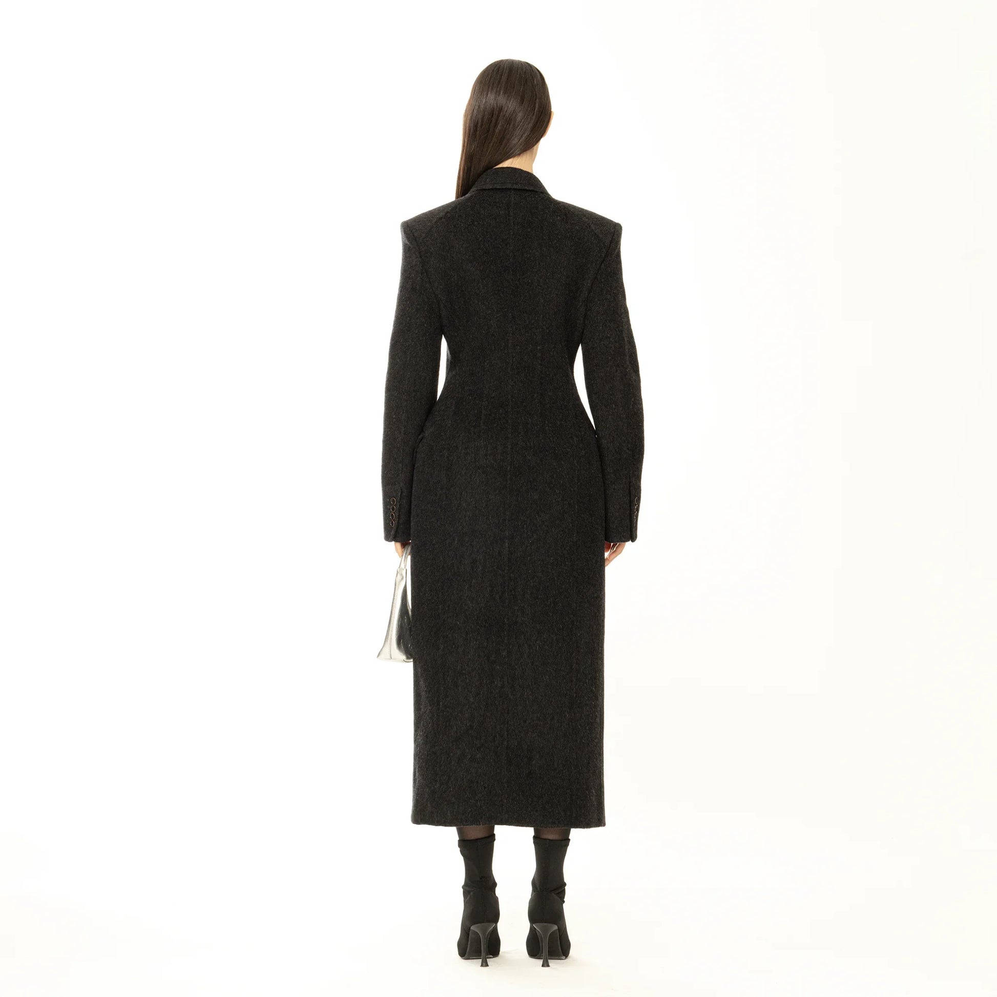 This long women's coat is a statement piece that defines confidence and sophistication. This is the trendiest design in the aléas. collection - sharp, tailored, and bold.